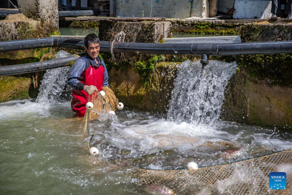 A staff member catches rainbow trout at a cold-water fish farming base in Ming'an Village, Liaozi Township, Chengkou County, southwest China's Chongqing, Oct. 11, 2022. Taking advantage of the ecological resources, cold-water fish farming in Liaozi Township has become a distinctive local industry and increased the villagers' income. (Xinhua/Huang Wei)