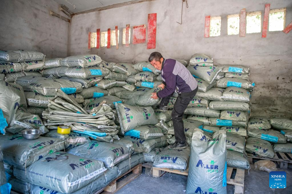 A staff member moves a bag of fish feed at a cold-water fish farming base in Ming'an Village, Liaozi Township, Chengkou County, southwest China's Chongqing, Oct. 11, 2022. Taking advantage of the ecological resources, cold-water fish farming in Liaozi Township has become a distinctive local industry and increased the villagers' income. (Xinhua/Huang Wei)