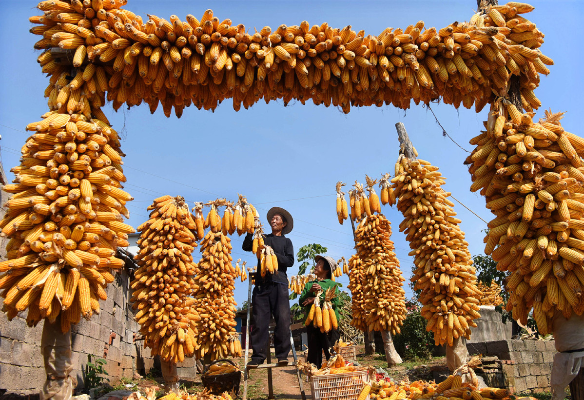 Farmers air harvest corn in Xinmiao village of Zibo, East China's Shandong province, Oct 8, 2022. [Photo/Xinhua]