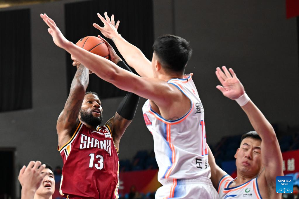 Clarence Weems (2nd L) of Shanxi Loongs shoots the ball during the 1st round match between Sichuan Blue Whales and Shanxi Loongs at the 2022-2023 season of the Chinese Basketball Association (CBA) league in Hangzhou, east China's Zhejiang Province, Oct. 12, 2022. (Xinhua/Chen Zhenhai)