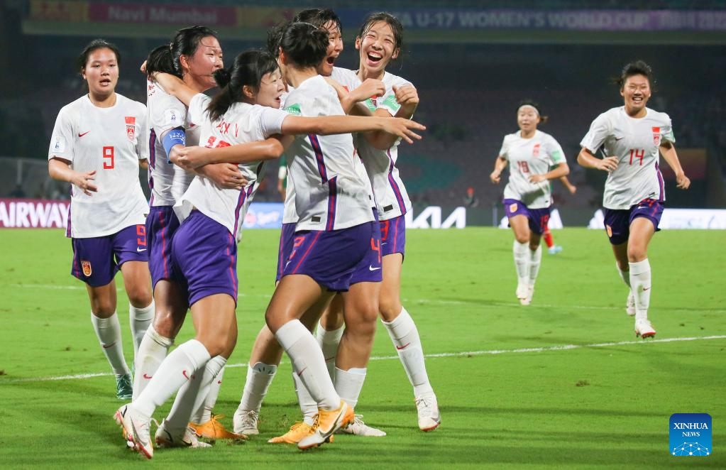 Players of China celebrate after scoring during the first round of group C match against Mexico at the FIFA U17 Women's World Cup in Navi Mumbai, India, on Oct. 12, 2022. (Str/Xinhua)