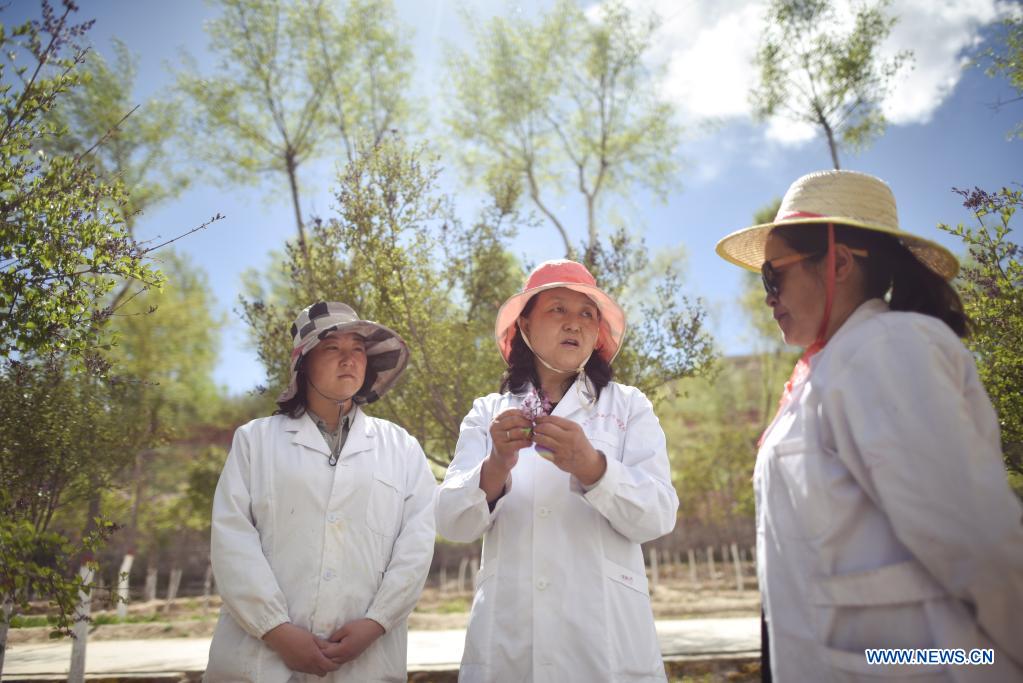 Zhang Jinmei (C) discusses the growth of lilacs with colleagues at a seedling breeding base of Xining forestry science research center in northwest China's Qinghai Province, May 6, 2021. (Xinhua/Wu Gang)