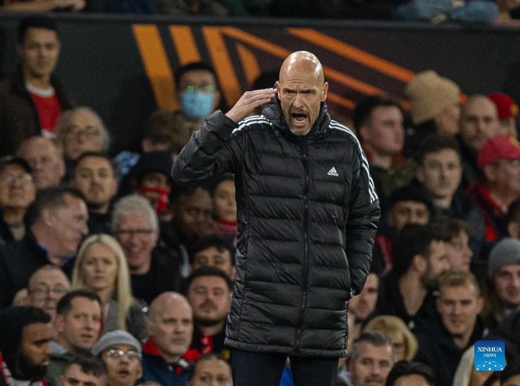 Manchester United's manager Erik ten Hag reacts during the UEFA Europa League Group E match between Manchester United and Omonia FC in Manchester, Britain, on Oct. 13, 2022. (Xinhua)