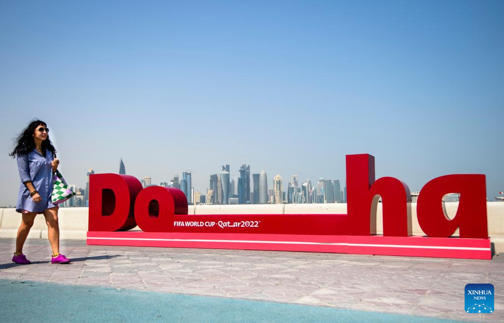 A pedestrian walks past the FIFA World Cup installation on the Doha Corniche in Doha, Qatar, Oct. 12, 2022. (Photo by Nikku/Xinhua)