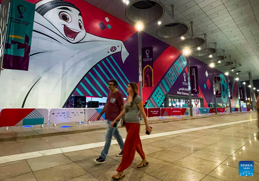 People walk past the FIFA World Cup installation at the main ticketing center in Doha, Qatar, Oct. 13, 2022. (Photo by Nikku/Xinhua)
