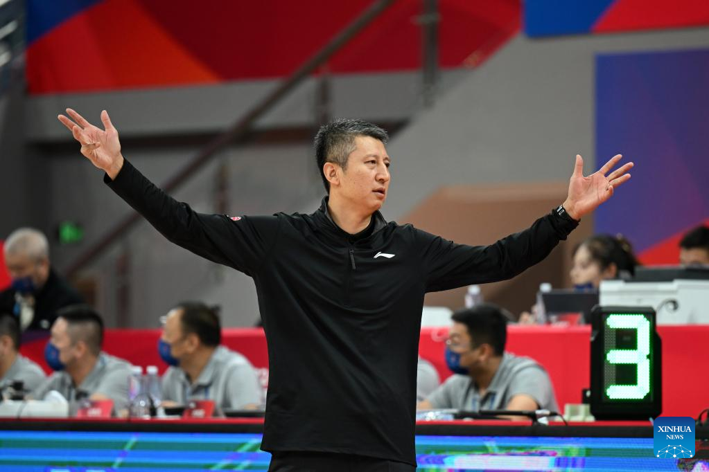 Head coach Guo Shiqiang of Guangzhou Loong Lions reacts during the 2nd round match between Guangzhou Loong Lions and Sichuan Blue Whales at the 2022-2023 season of the Chinese Basketball Association (CBA) league in Hangzhou, east China's Zhejiang Province, Oct. 14, 2022. (Xinhua/Chen Zhenhai)