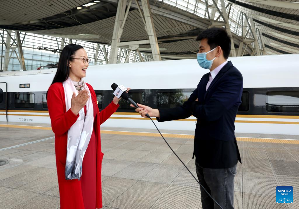 Yu Xiaqiu (L), a delegate from Jiangsu Province to the 20th National Congress of the Communist Party of China (CPC), speaks during an interview upon her arrival in Beijing, capital of China, Oct. 14, 2022. Delegates from Jiangsu Province to the 20th CPC National Congress arrived in Beijing on Friday. (Xinhua/Chen Jianli)