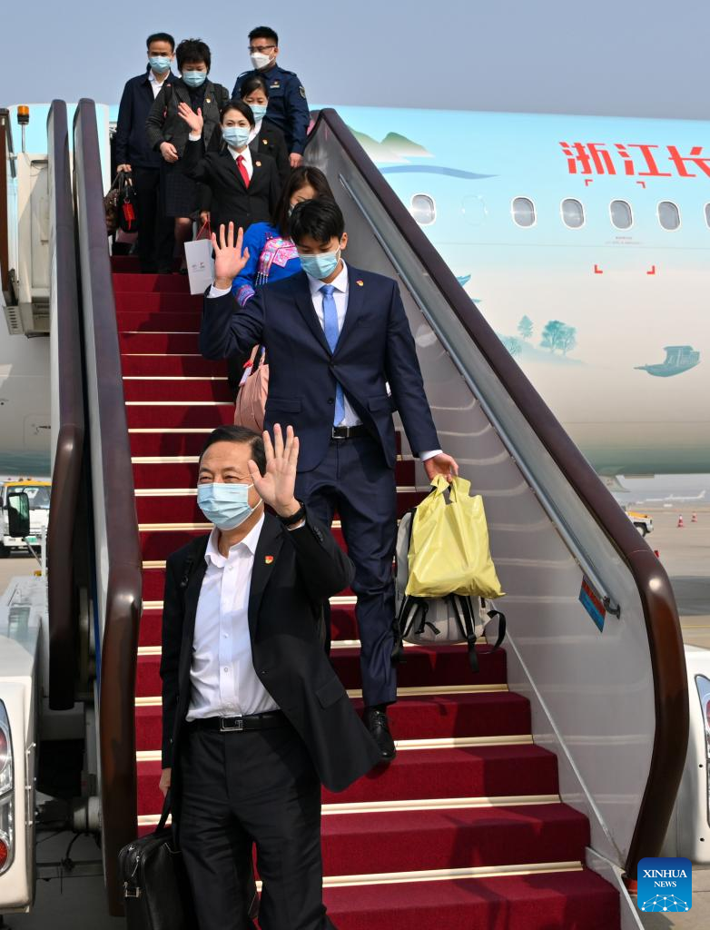 Delegates from Zhejiang Province to the 20th National Congress of the Communist Party of China (CPC) arrive in Beijing, capital of China, Oct. 14, 2022. (Xinhua/Chen Yichen)