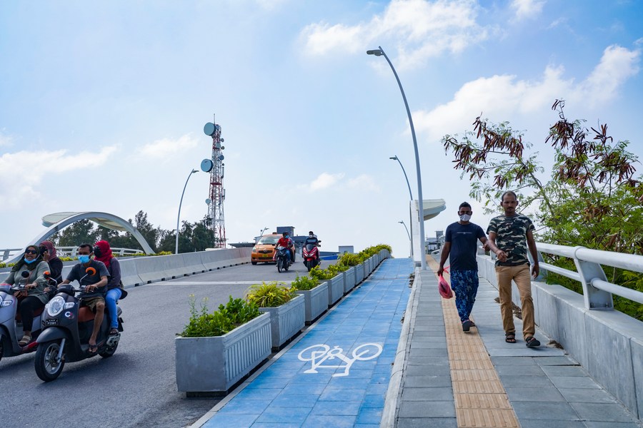 People pass through a bridge built by the China State Construction Engineering Corporation (CSCEC) in Hulhumale, Maldives, Jan. 7, 2022.(Xinhua/Tang Lu)
