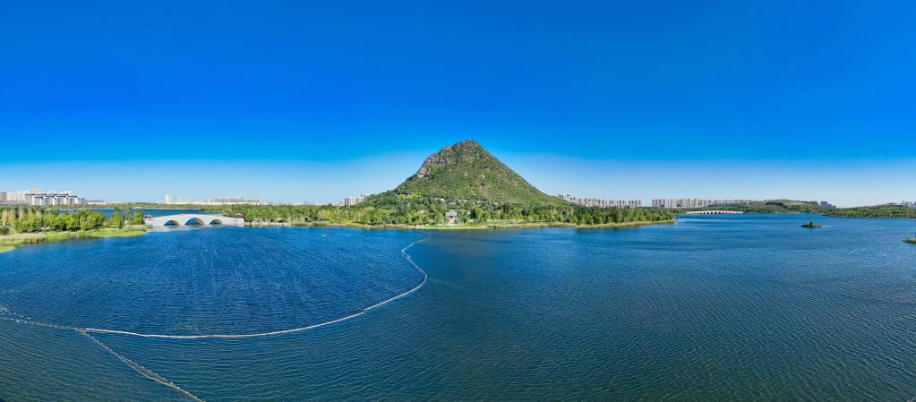 Aerial panoramic photo taken on Oct. 9, 2022 shows the Huashan scenic area in Jinan, east China's Shandong Province. (Photo by Xu Zhou/Xinhua)