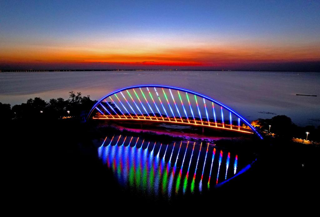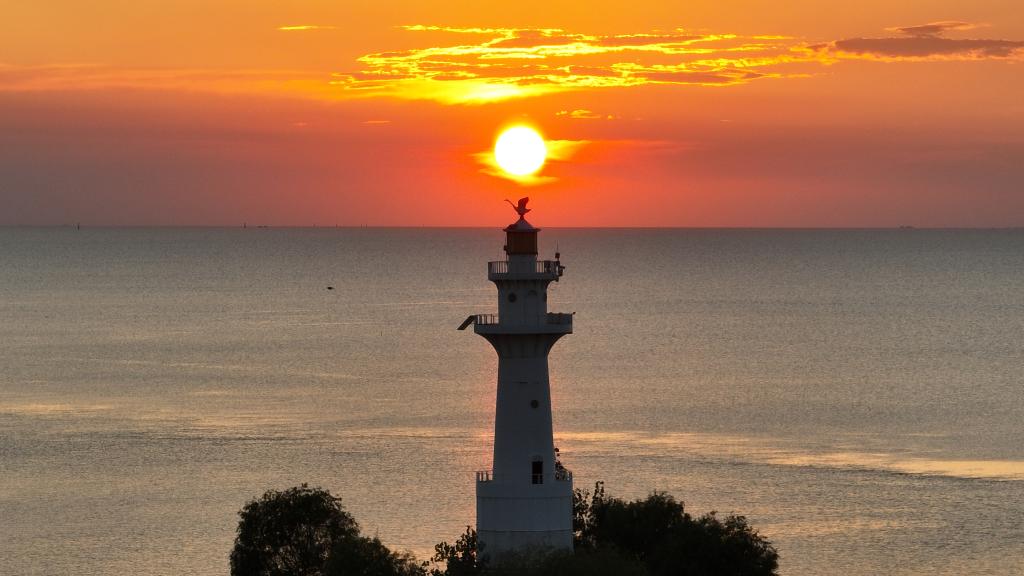 Aerial photo taken on Sept. 26, 2022 shows a lighthouse by the Hongze Lake at sunset in Huai'an City, east China's Jiangsu Province. (Photo by Wan Zhen/Xinhua)