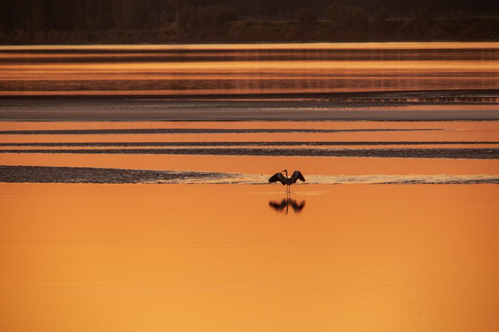 A waterfowl is seen in the lower reach of the Yellow River in Gaoqing County, east China's Shandong Province, Oct. 10, 2022. (Photo by Zhang Weitang/Xinhua)