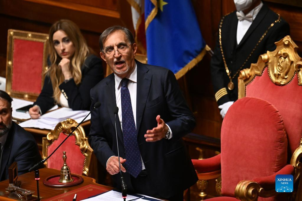 The newly elected president of the Italian Senate Ignazio La Russa (front) speaks at the Senate in Rome, Italy, on Oct. 13, 2022. Lorenzo Fontana, a two-time minister from a party likely to be a junior member of the next Italian government coalition, was selected on Friday as speaker of the lower house of Italy's parliament. Fontana's selection as speaker of the Chamber of Deputies followed the selection of Ignazio La Russa Thursday as president of the Senate, the upper house of parliament. (Photo by Alberto Lingria/Xinhua)