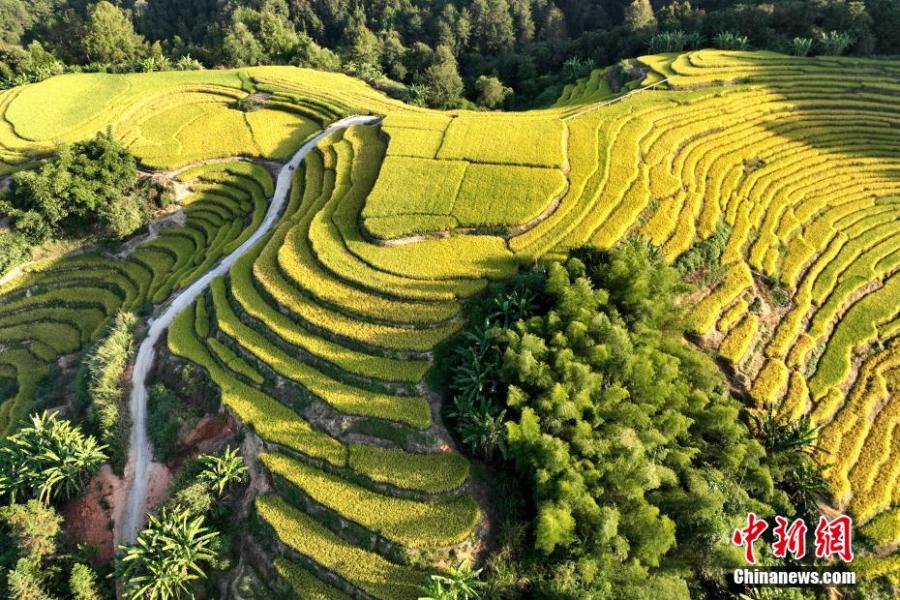 Aerial view shows picturesque scene of golden terraced fields in Shanghang County of Longyan City, east China's Fujian Province, Oct. 13, 2022. More than 1,500 hectares of paddy rice entered harvest. (Photo: China News Service/Zhang Jinchuan)