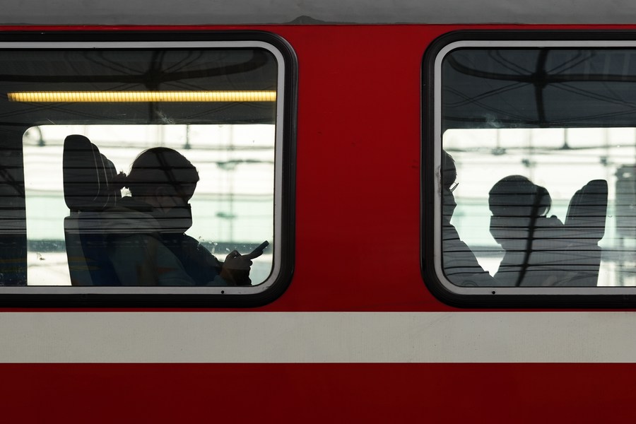 Passengers wearing face masks are seen on a train in Berlin, capital of Germany, April 1, 2022. (Photo by Stefan Zeitz/Xinhua)