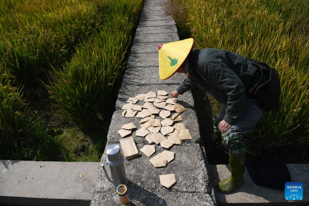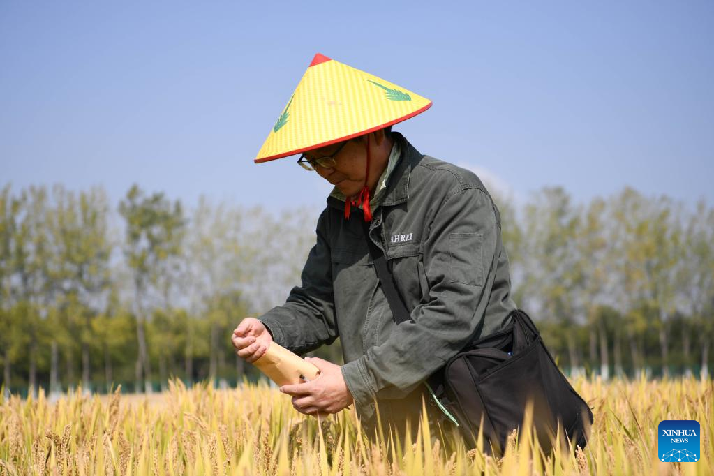 A staff member of Rice Research Institute of Anhui Academy of Agricultural Sciences collects rice seeds at a demonstration test paddy in Baohe District of Hefei, east China's Anhui Province, Oct. 15, 2022.