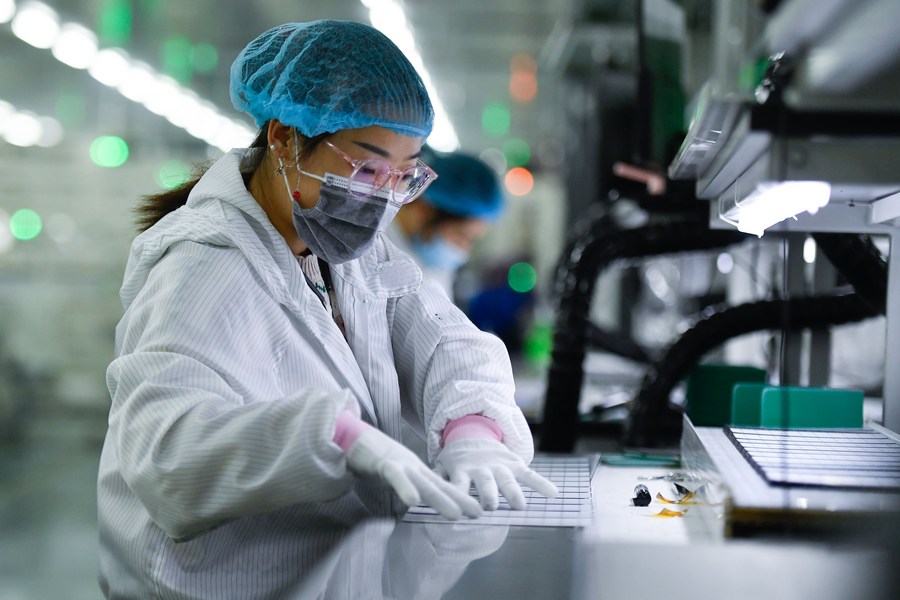 A worker welds solar power components at a workshop of the Jinko Solar (Yiwu) Co., Ltd. in Yiwu City, east China's Zhejiang Province, Jan. 15, 2021. (Xinhua/Huang Zongzhi)