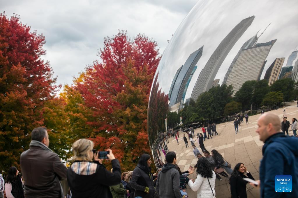 People take photos near the Cloud Gate, also known as The Bean, at Millennium Park in downtown Chicago, the United States, Oct. 16, 2022. (Photo by Vincent D. Johnson/Xinhua)