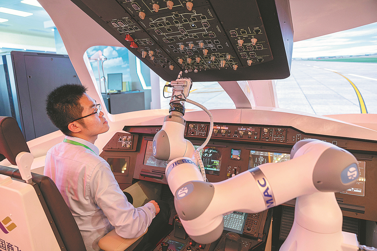 A worker displays a smart flight research platform developed by Commercial Aircraft Corporation of China at an exhibition highlighting China's scientific development during the 13th Five-Year Plan (2016-20) period in Beijing in October last year. CAI YANG/XINHUA