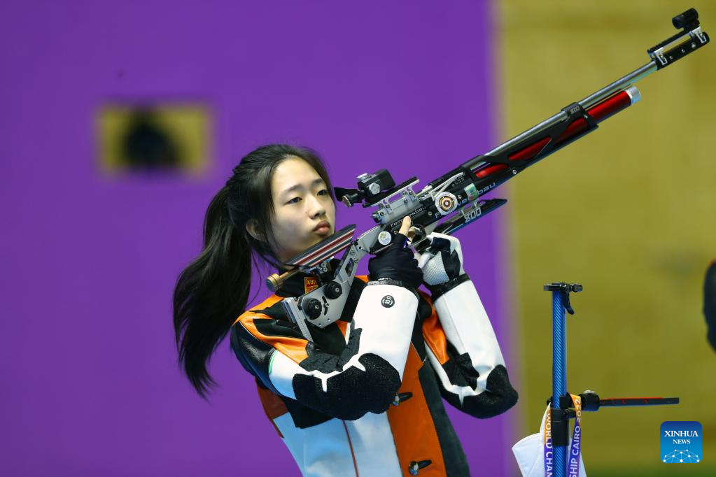 Huang Yuting of China competes during the 10m air rifle mixed team gold medal match between China and South Korea at the ISSF World Championship Rifle/Pistol in Cairo, Egypt, Oct. 17, 2022. (Xinhua/Ahmed Gomaa)