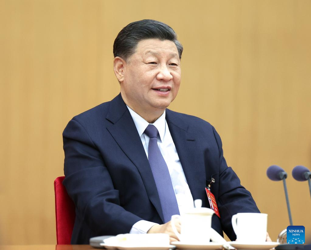 Xi Jinping joins a group discussion with delegates from south China's Guangxi Zhuang Autonomous Region who are attending the 20th National Congress of the Communist Party of China (CPC) in Beijing, Oct. 17, 2022. (Xinhua/Ju Peng)