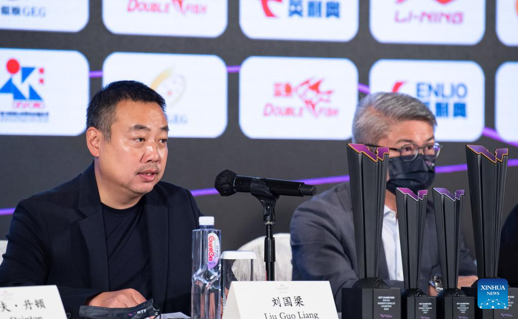 Liu Guoliang (L), chairman of the World Table Tennis (WTT) board and president of the Chinese Table Tennis Association (CTTA), speaks during press conference before the drawing ceremony of WTT Champions Macao 2022 in Macao, south China, Oct. 18, 2022. (Xinhua/Cheong Kam Ka)