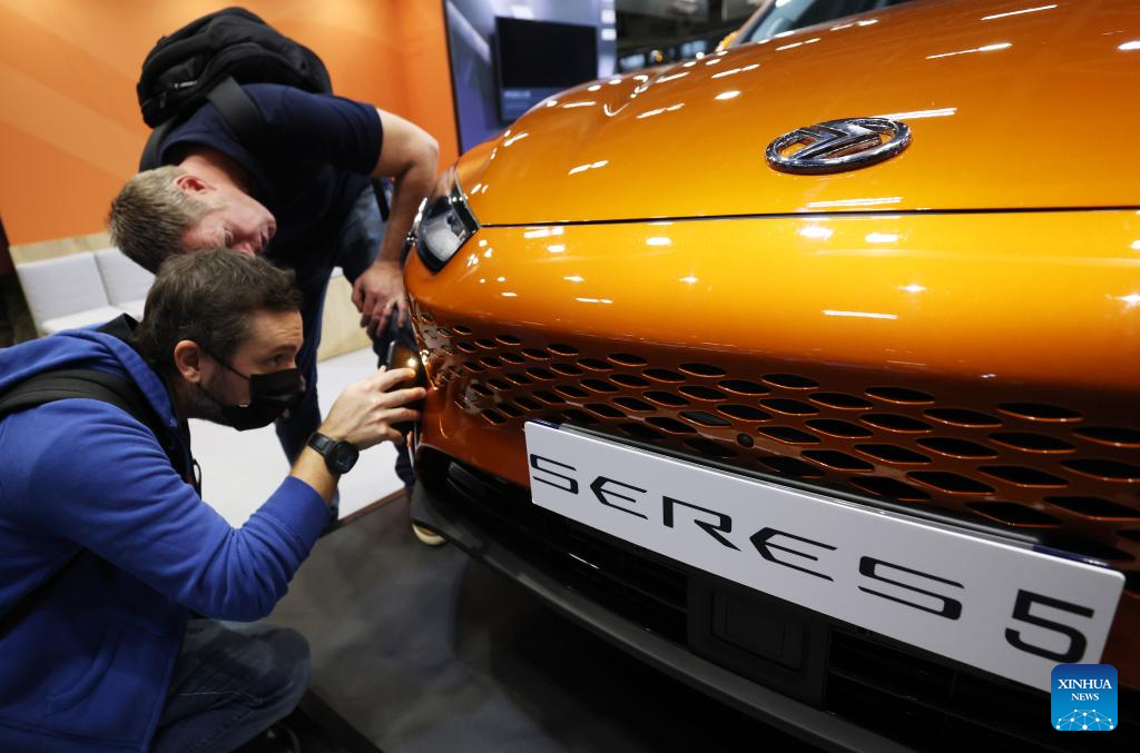 People visit the SERES stand during the Paris Motor Show in Paris, France, Oct. 18, 2022. The 89th Paris Motor Show is held here from Oct. 17 to 23. (Xinhua/Gao Jing)