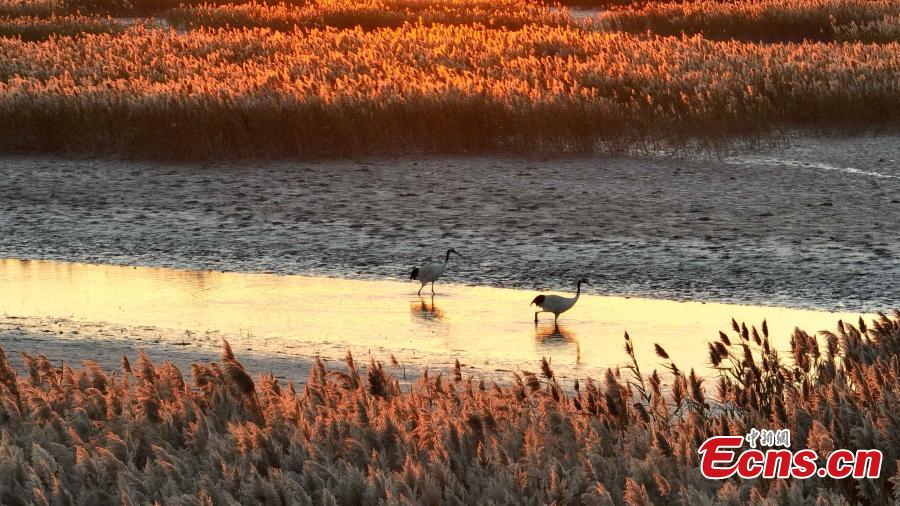 Red-crowned cranes forage at the Yellow River estuary where the Yellow River, China's second-longest river, joins the Bohai Sea in Dongying, east China's Shandong Province, Oct. 17, 2022. (Photo: China News Service/Yang Bin)