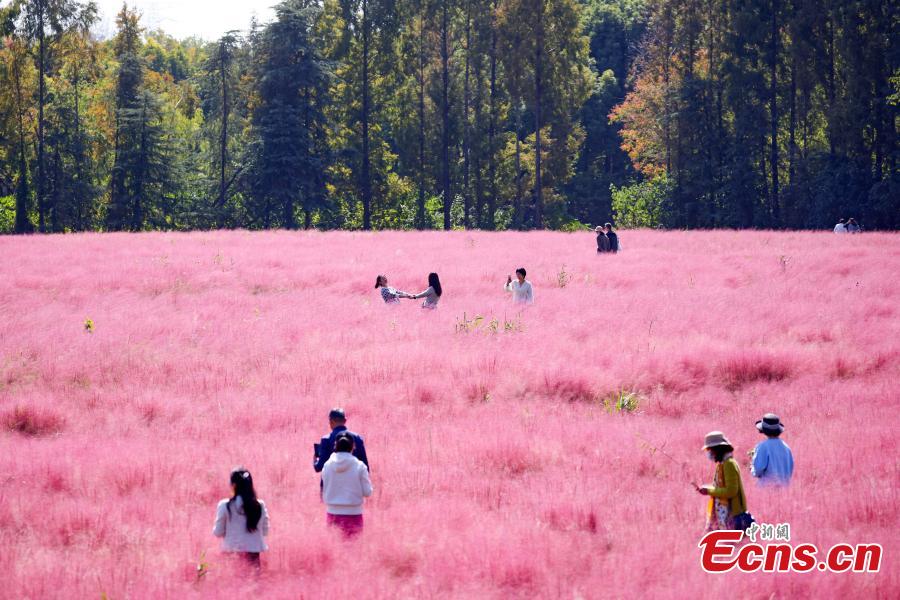 Visitors pose for photos at a field of pink muhly grass at Sanqiao wetland park in Nanjing, east China's Jiangsu Province, Oct. 18, 2022. (Photo: China News Service/Yang Bo)