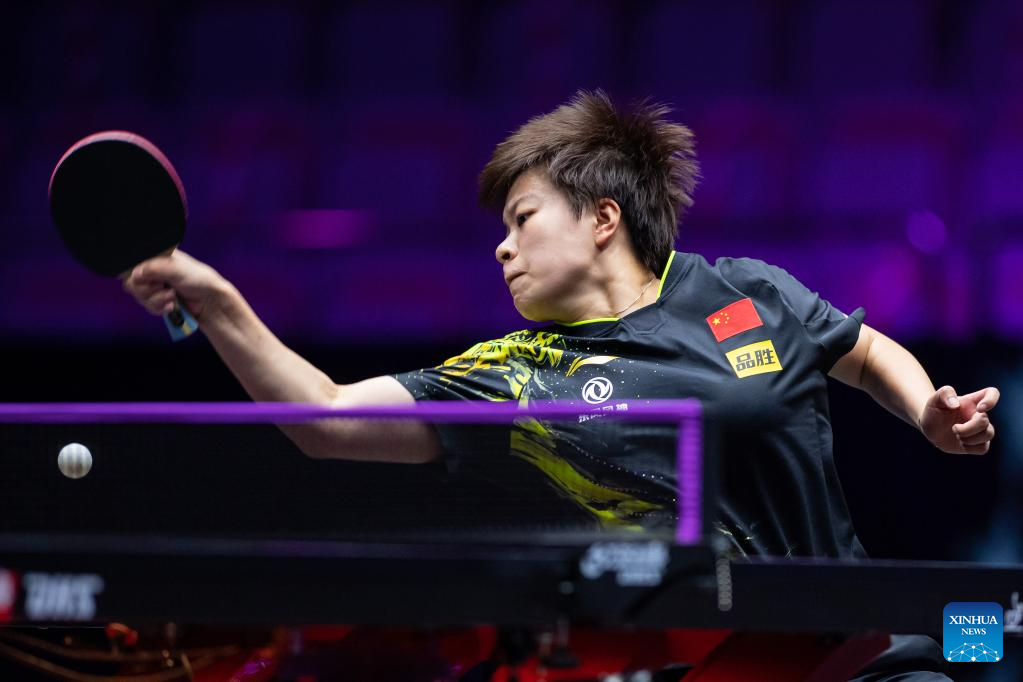 Wang Yidi of China hits a return during the women's singles round of 32 match against Hana Goda of Egypt at the WTT Champions Macao 2022 in Macao, south China, Oct. 19, 2022. (Xinhua/Cheong Kam Ka)