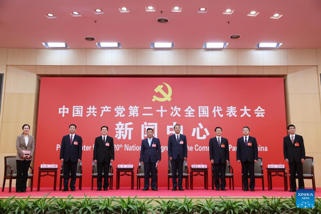 The spokespersons for delegations from Shandong, Henan, Hubei, Hunan, Guangdong, Guangxi and Hainan to the 20th National Congress of the Communist Party of China (CPC) meet the press during a group interview in Beijing, capital of China, Oct. 19, 2022. The press center for the 20th CPC National Congress hosted its third group interview on Wednesday. During the interview, the spokespersons introduced the delegations' study and discussion on the report to the 20th CPC National Congress, and answered questions from journalists. (Xinhua/Chen Jianli)