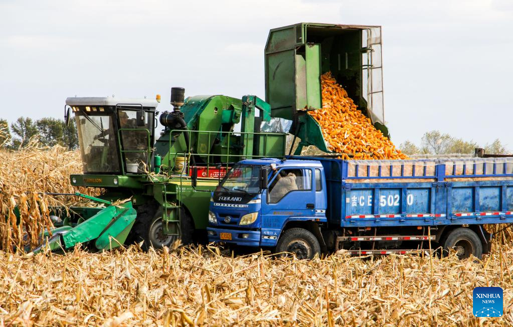 Farmers harvest corn in Horqin Left Wing Middle Banner of Tongliao City, north China's Inner Mongolia Autonomous Region, Oct. 17, 2022. (Xinhua/Lian Zhen)