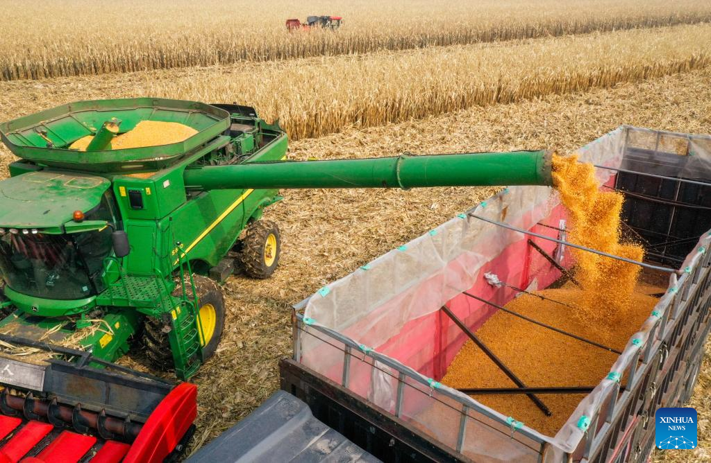 This aerial photo shows farmers harvesting corn in Horqin District of Tongliao City, north China's Inner Mongolia Autonomous Region, Oct. 14, 2022. (Xinhua/Lian Zhen)