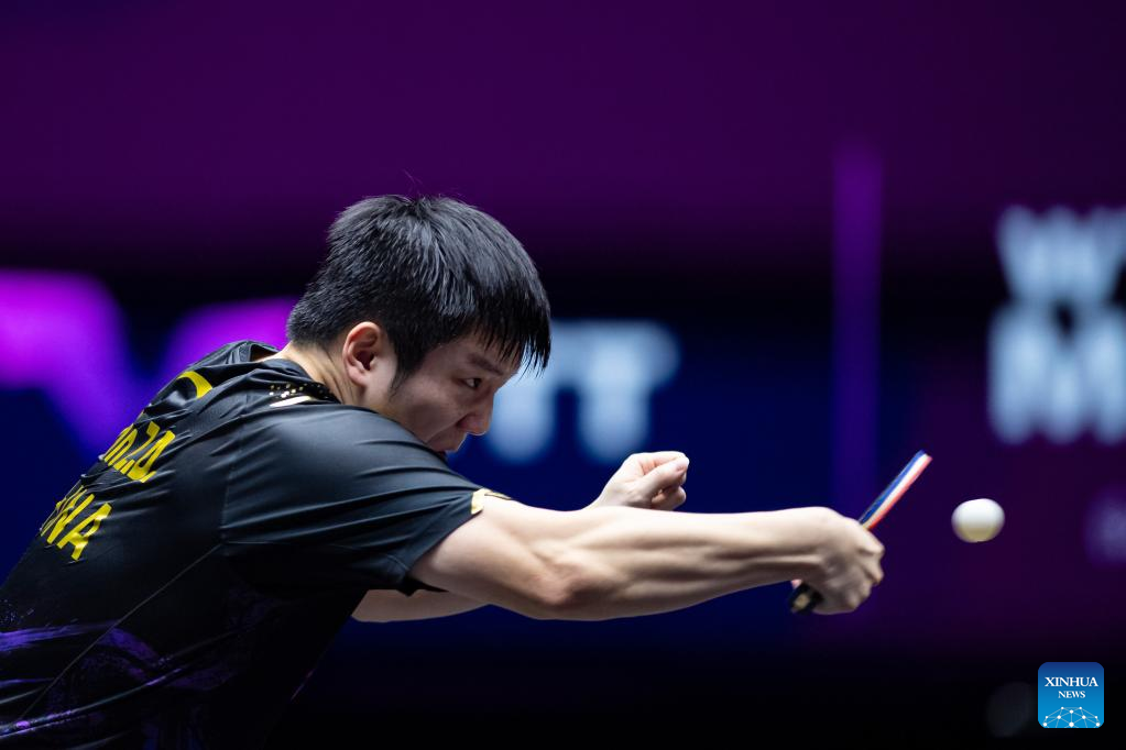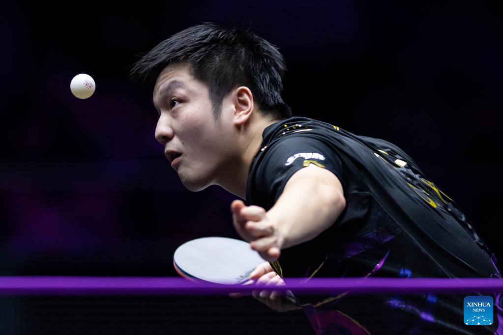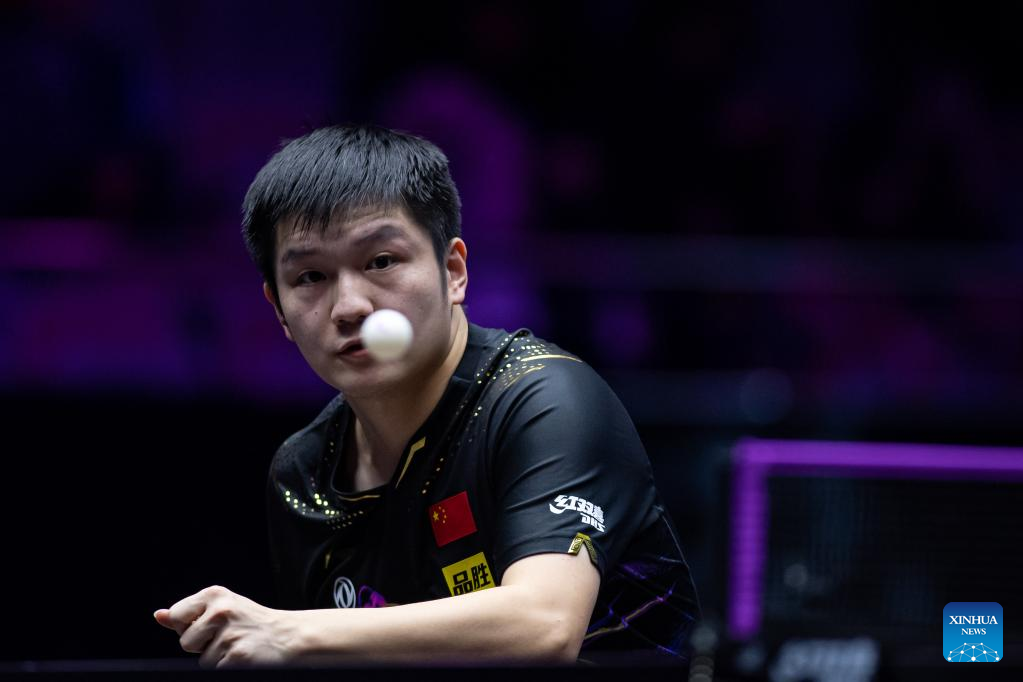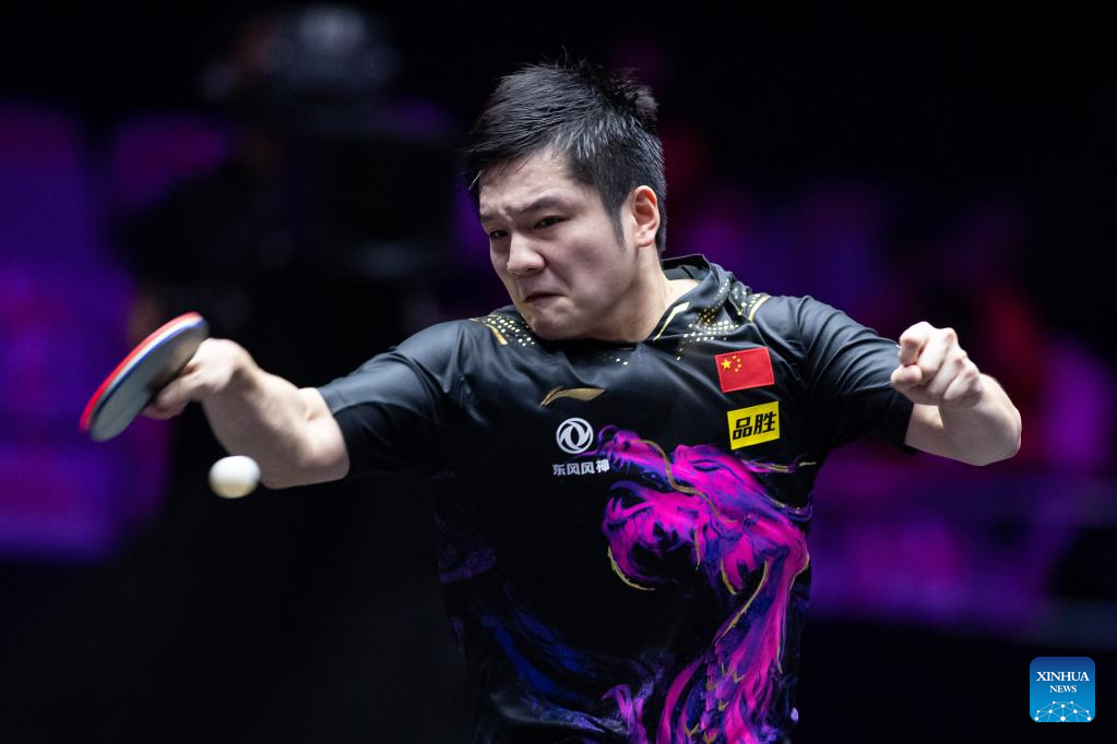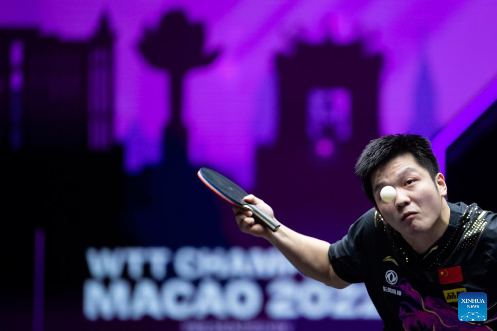 Fan Zhendong of China hits a return during the men's singles round of 32 match against Wong Chun Ting of China's Hong Kong at the WTT Champions Macao 2022 in Macao, south China, Oct. 20, 2022. (Xinhua/Cheong Kam Ka)