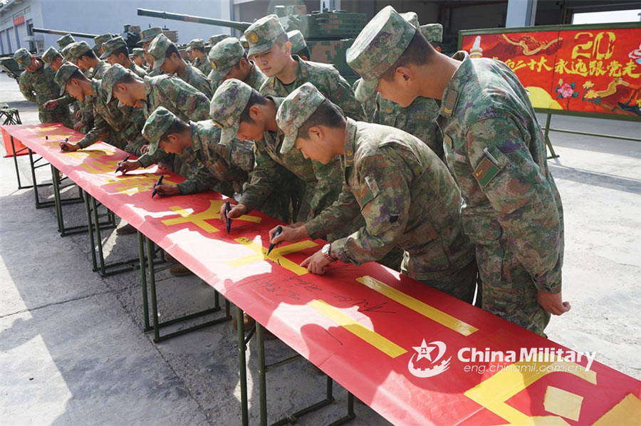 Soldiers assigned to a combined-arms brigade under the PLA 82nd Group Army sign their names on a banner on October 16, 2022, to express their determination to devote themselves to the cause of strengthening the Chinese military. (eng.chinamil.com.cn/Photo by Sun Tongkai)