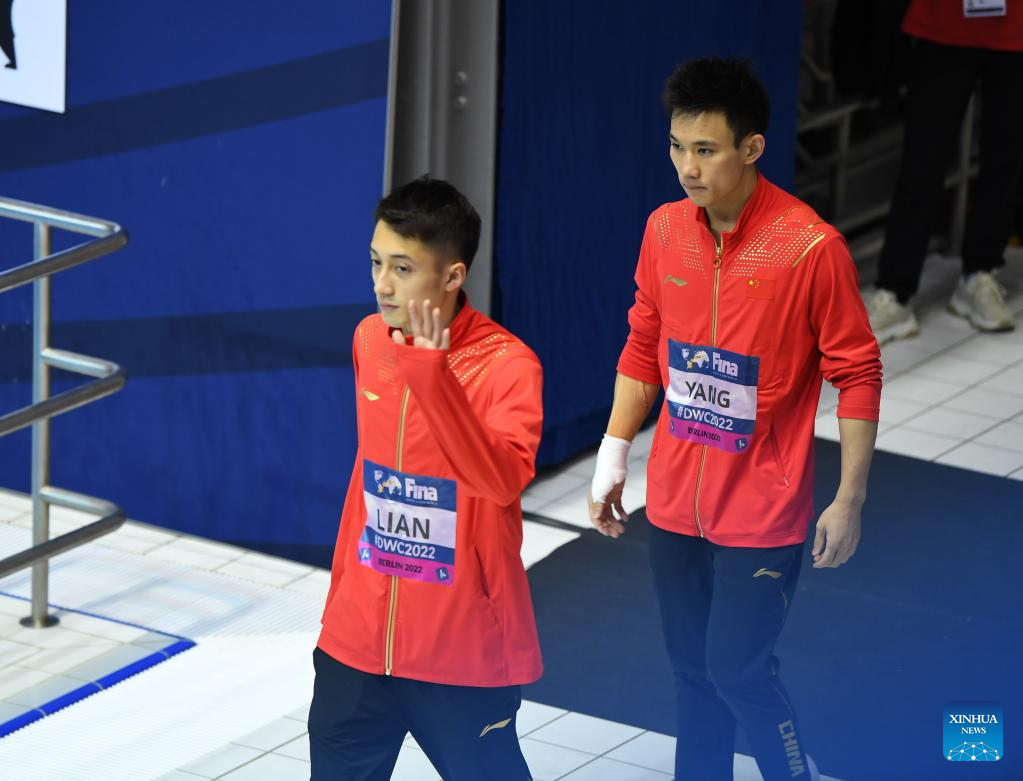 Lian Junjie (L)/Yang Hao of China react before the men's synchronized 10m plaform final at the FINA Diving World Cup in Berlin, Germany, Oct. 21, 2022. (Xinhua/Ren Pengfei)