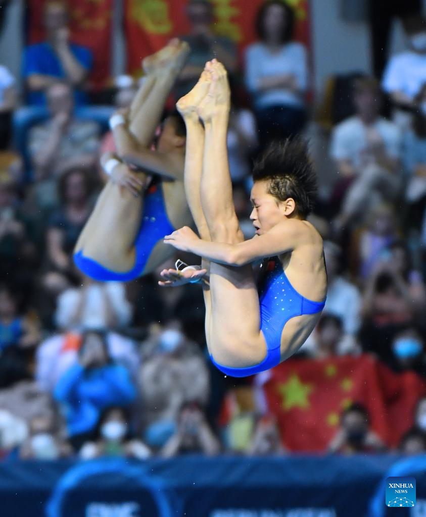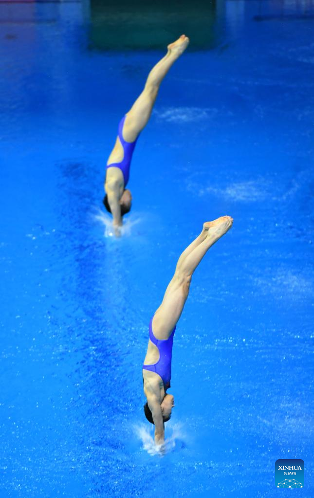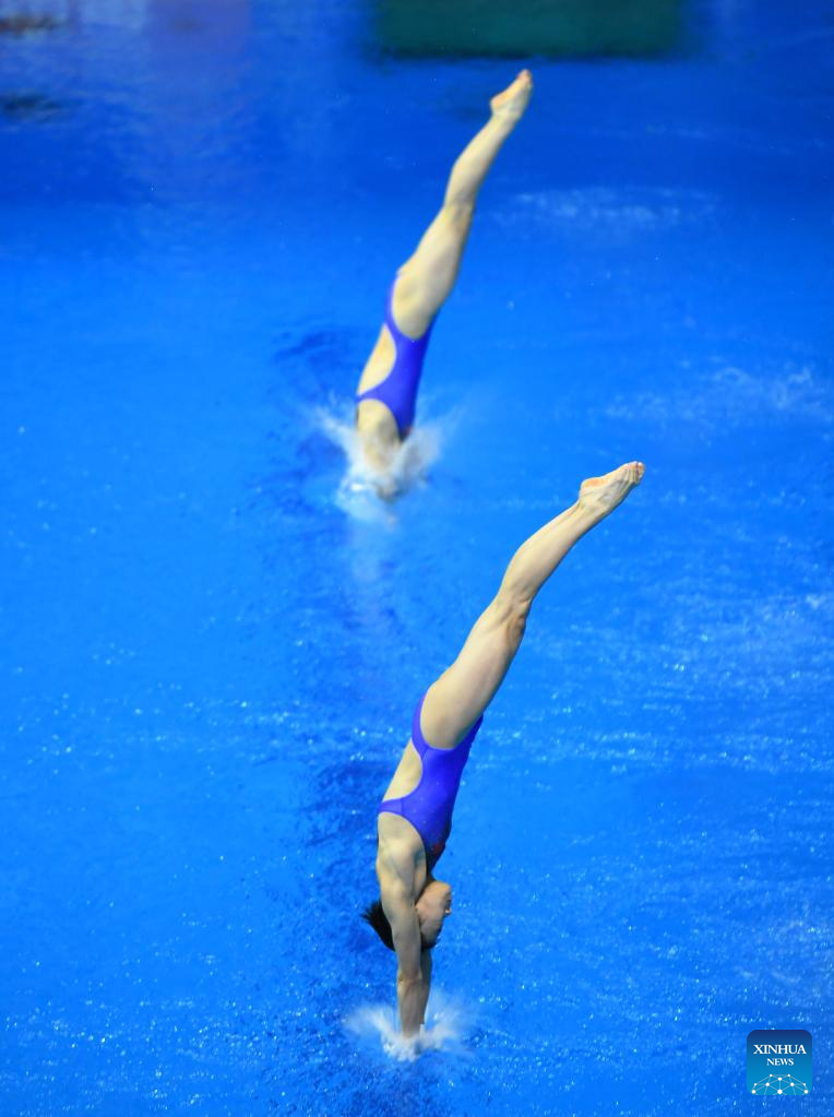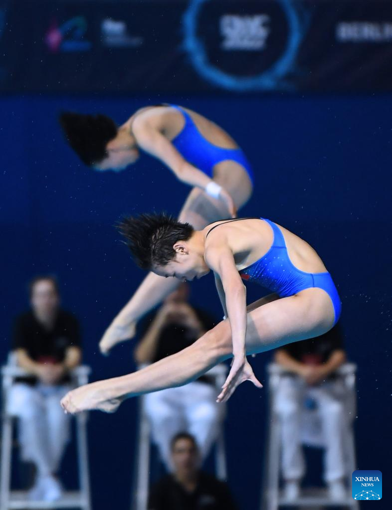 Chen Yuxi/Quan Hongchan (front) of China compete during the women's synchronized 10m platform final at the FINA Diving World Cup in Berlin, Germany, Oct. 21, 2022. (Xinhua/Ren Pengfei)