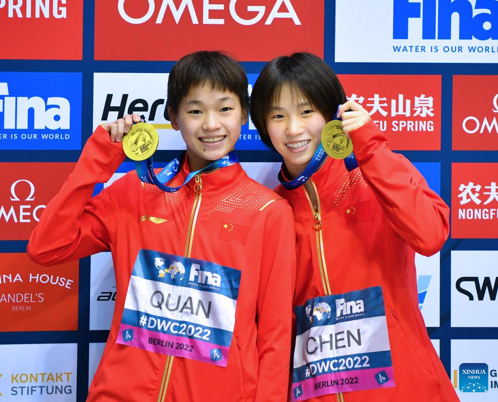 Chen Yuxi/Quan Hongchan (L) of China pose for photos during the awarding ceremony of the women's synchronized 10m platform final at the FINA Diving World Cup in Berlin, Germany, Oct. 21, 2022. (Xinhua/Ren Pengfei)