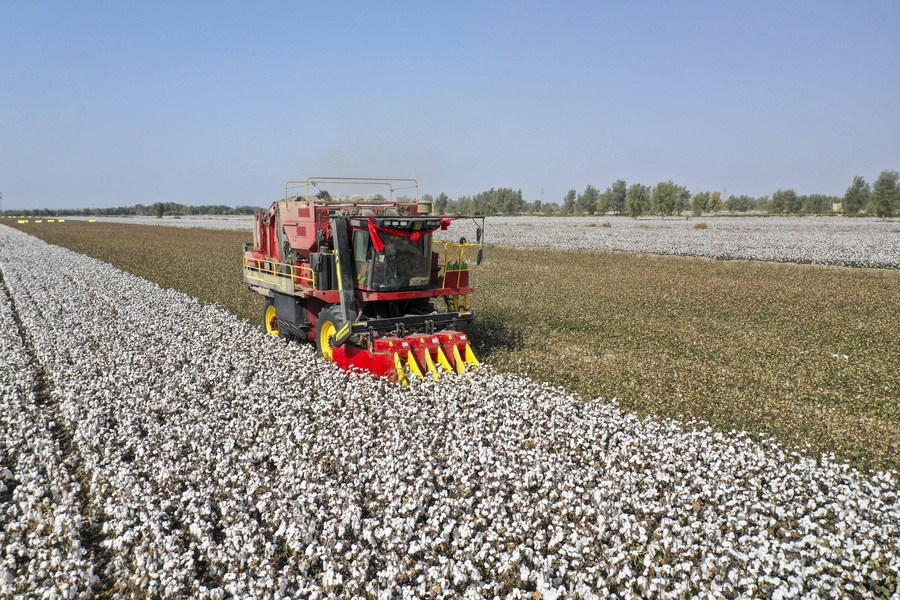 This aerial photo taken on Oct. 14, 2022 shows a domestically-made machinery cotton picker working in a cotton field in Xingping Township of Yuli County, northwest China's Xinjiang Uygur Autonomous Region. (Photo by Wang Zhipeng/Xinhua)