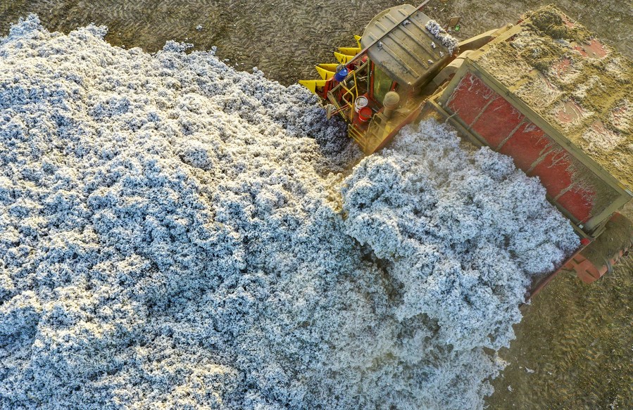 This aerial photo taken on Oct. 17, 2022 shows cotton being poured from a machinery cotton picker in a cotton field in Hongqi Township of Xayar County, northwest China's Xinjiang Uygur Autonomous Region. (Photo by Liu Yuzhu/Xinhua)