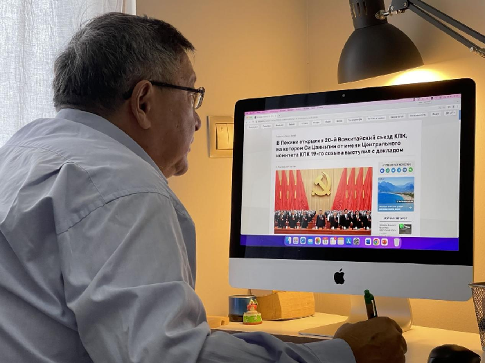 Serik Korzhumbayev, editor-in-chief of Delovoy Kazakhstan newspaper, reads news stories about the 20th National Congress of the Communist Party of China online. (Photo courtesy of the interviewee)