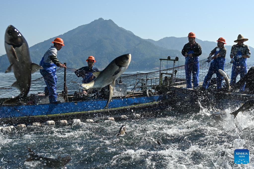 Fishermen catch fish in cooperation using a huge fishnet on Huangshanjian waters of the Qiandao Lake in Chun'an County, east China's Zhejiang Province, Oct. 22, 2022. (Xinhua/Huang Zongzhi)