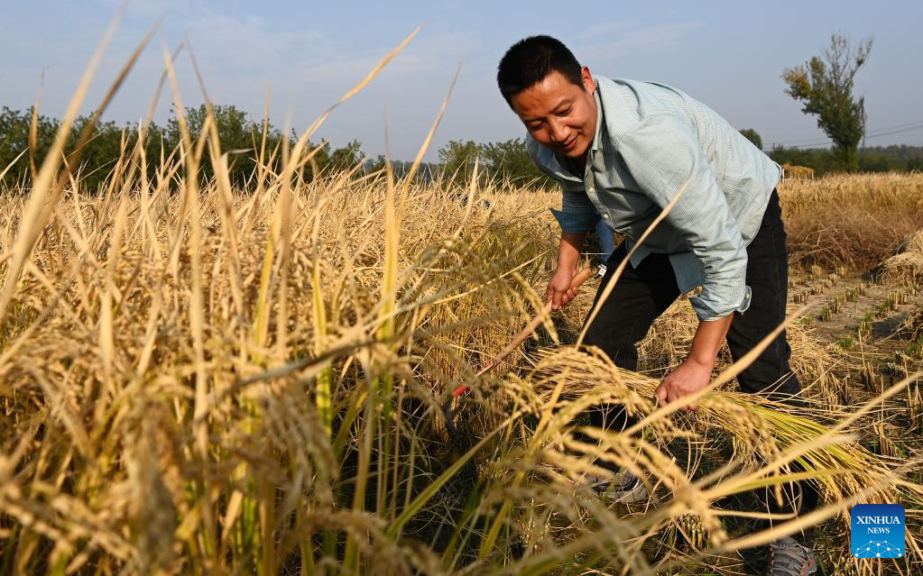 A villager harvests paddy rice in Huangfu Village, Chang'an District of Xi'an City, northwest China's Shaanxi Province, Oct. 21, 2022. In recent years, Chang'an District develops ecological paddy fields and combines paddy rice industry with tourism, which improves the quality of local paddy rice and local economy. (Xinhua/Liu Xiao)