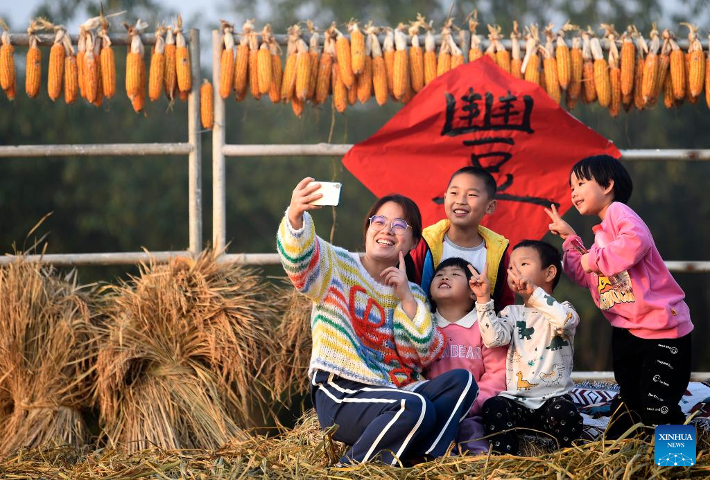 People pose for a photo at a paddy scenic spot in Huangfu Village, Chang'an District of Xi'an City, northwest China's Shaanxi Province, Oct. 21, 2022. In recent years, Chang'an District develops ecological paddy fields and combines paddy rice industry with tourism, which improves the quality of local paddy rice and local economy. (Xinhua/Liu Xiao)