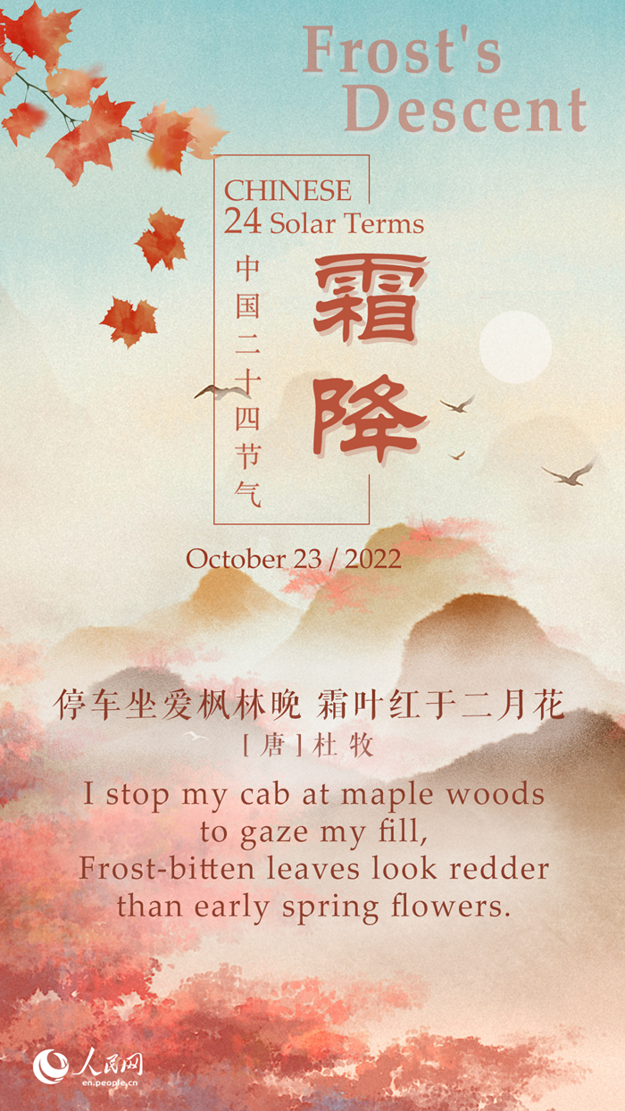 October 23 this year marks the beginning of the Frost's Descent, also known as "Shuangjiang" in Chinese, the 18th solar term on the Chinese lunar calendar. It is the last solar term of autumn, making it a transitional period into winter.