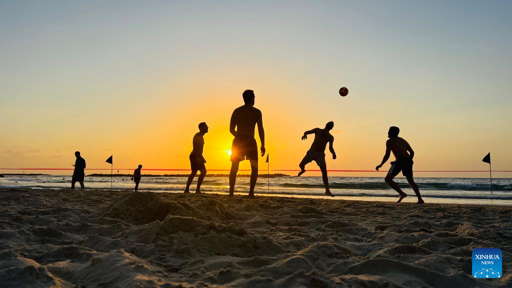 People play on the beach at sunset in the central Israeli city of Tel Aviv, Oct. 22, 2022. (Photo by Muammar Awad/Xinhua)