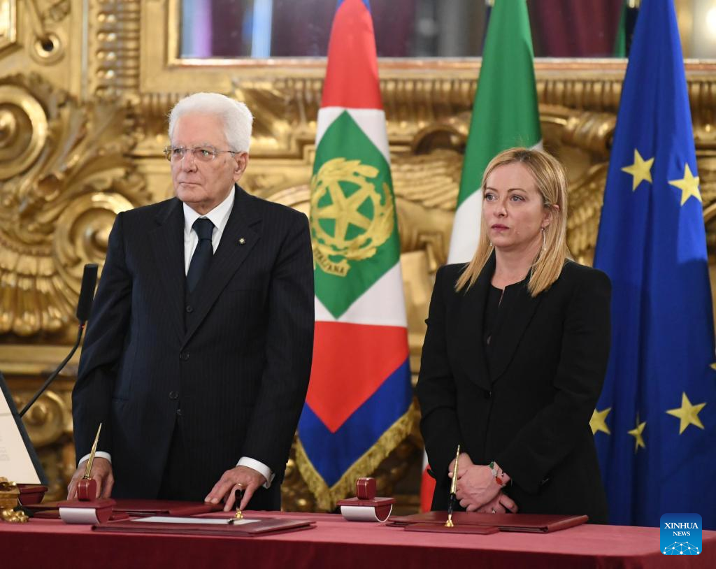 Italian President Sergio Mattarella (L) and newly appointed Prime Minister Giorgia Meloni attend the swearing-in ceremony at the presidential palace in Rome, Italy, Oct. 22, 2022. (Xinhua/Jin Mamengni)