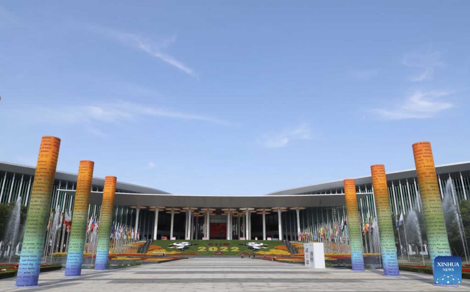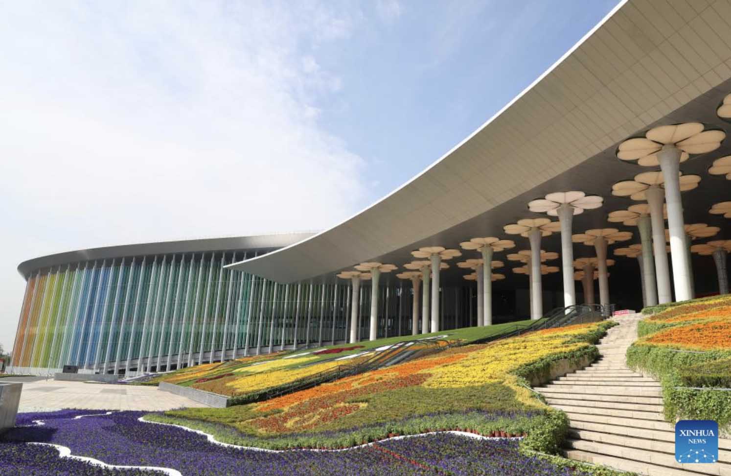 The south square of the National Exhibition and Convention Center (Shanghai), the main venue for the upcoming fifth China International Import Expo (CIIE), is pictured in east China's Shanghai, Oct. 24, 2022. The CIIE, the world's first dedicated import exhibition, will take place in Shanghai on Nov. 5-10. (Xinhua/Fang Zhe)