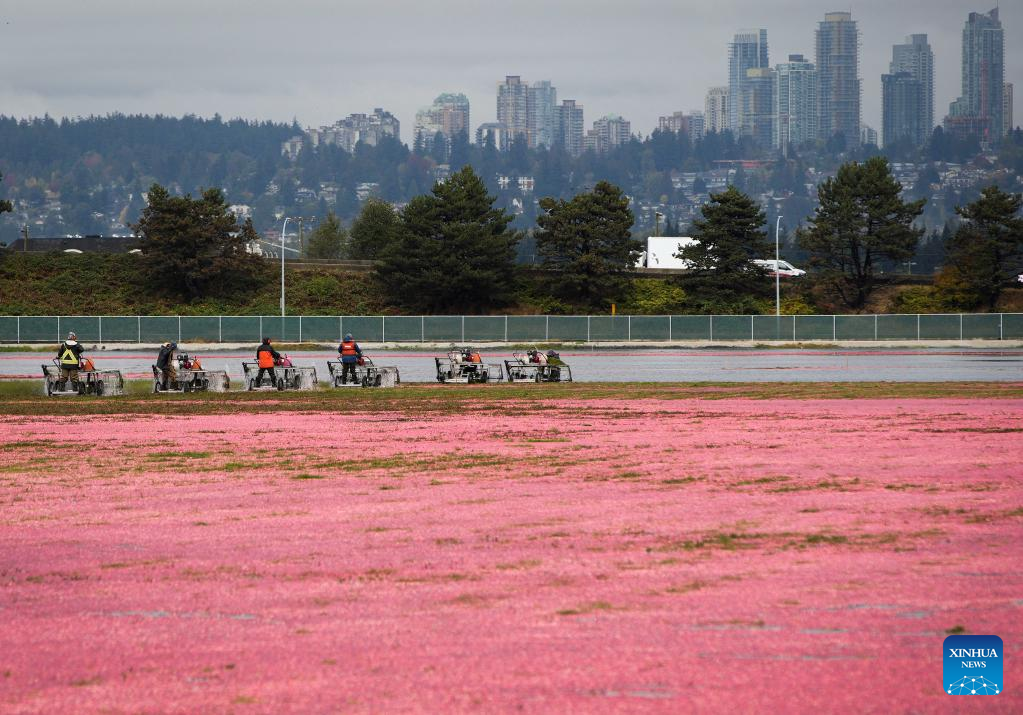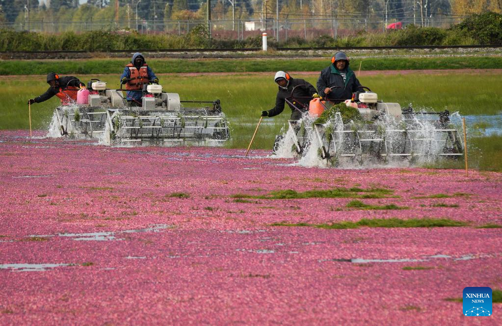 Workers harvest cranberries with specialized machines at a cranberry field in Richmond, British Columbia, Canada, on Oct. 24, 2022. (Photo by Liang Sen/Xinhua)