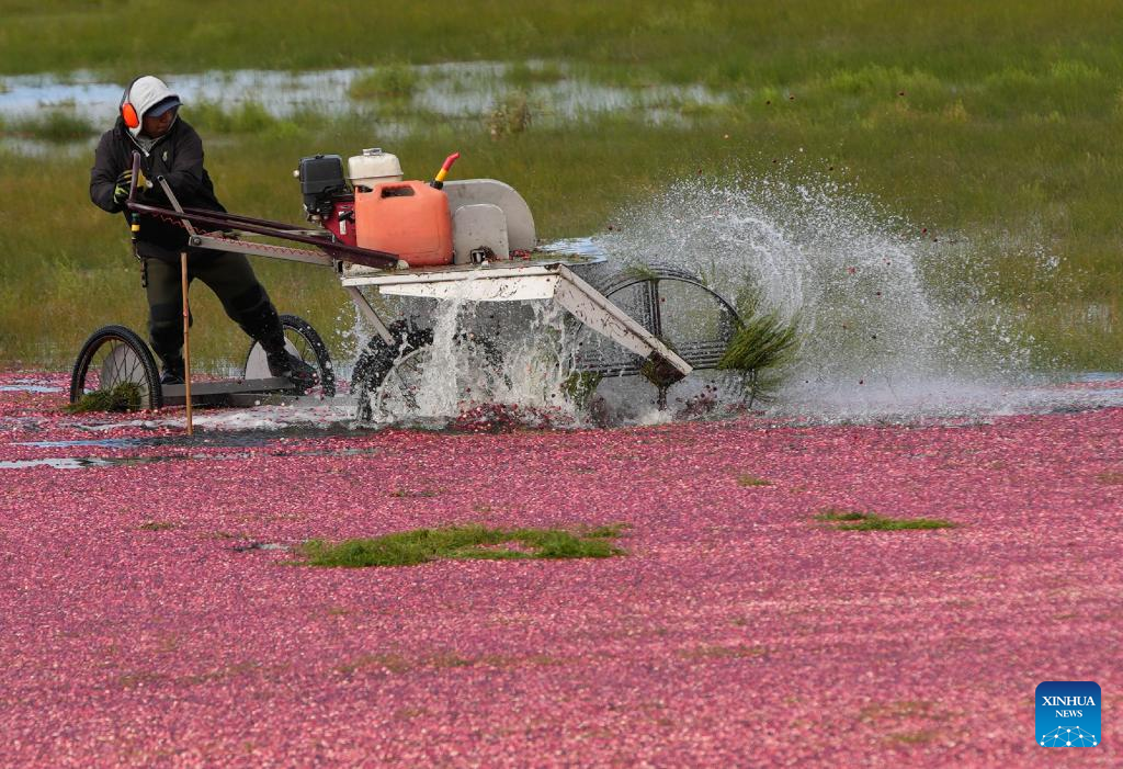 A worker harvests cranberries with a specialized machine at a cranberry field in Richmond, British Columbia, Canada, on Oct. 24, 2022. (Photo by Liang Sen/Xinhua)
